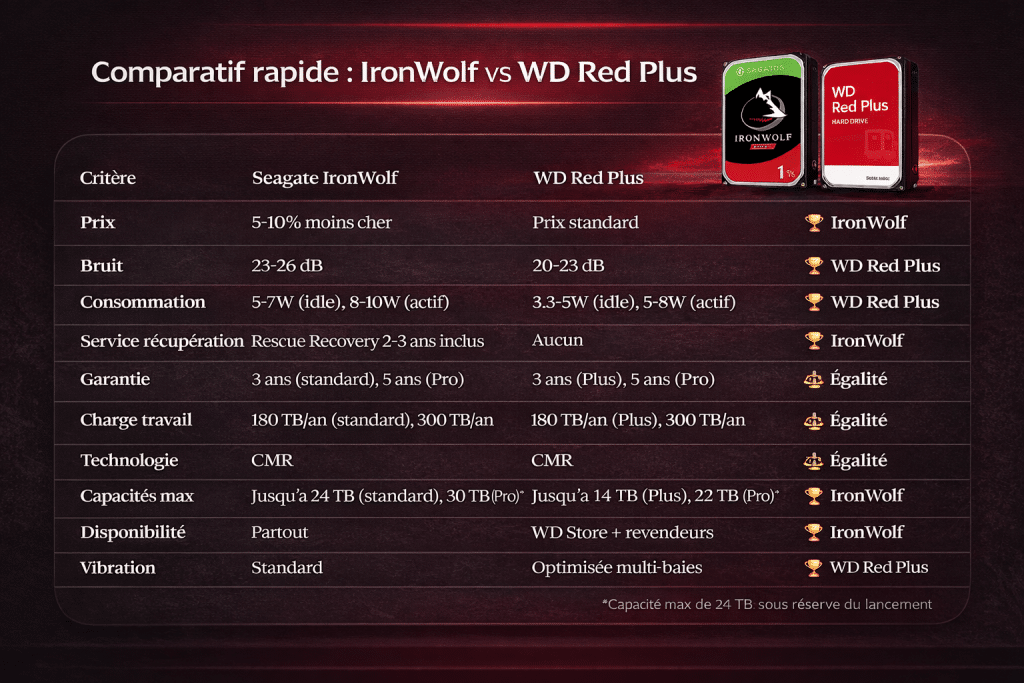 WD Red Plus utilise la technologie NASware 3.0 qui réduit les vibrations en configuration multi-baies. IronWolf a AgileArray (équivalent), mais dans la pratique, WD Red génère moins de vibrations parasites (retours utilisateurs + nos tests).